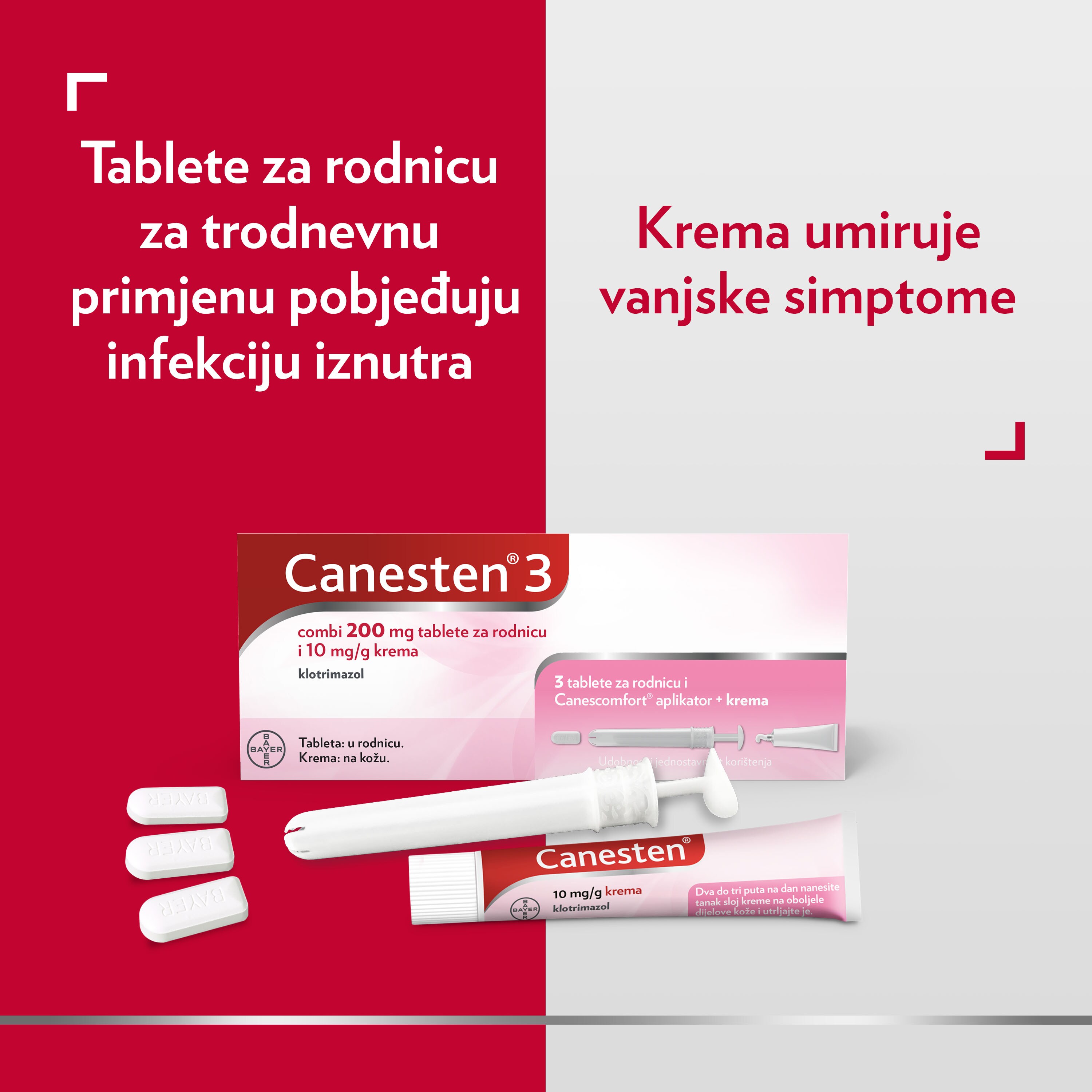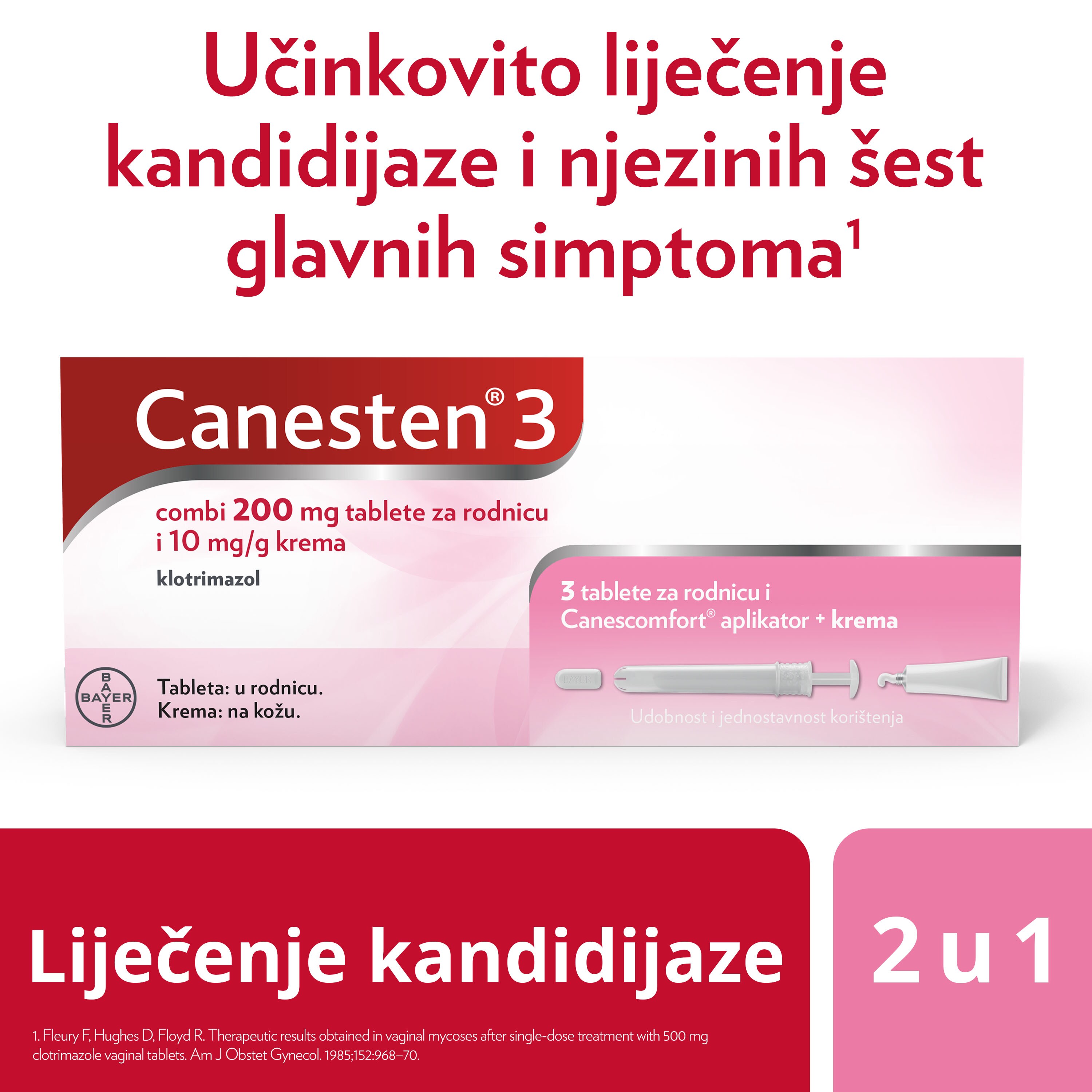 Canesten® je najprodavanija robna marka na svijetu za liječenje gljivičnih vaginalnih infekcija.1 CANESTEN® 3 combi pruža vam cjelovito i učinkovito liječenje u dvama koracima. Za razliku od nekih drugih proizvoda, CANESTEN® 3 combi liječi i uzrok i simptome kandidijaze. Ovaj cjeloviti kombinirani lijek sadržava tablete za rodnicu uobičajene jačine koje pobjeđuju infekciju uz trodnevnu primjenu i kremu za vanjsku primjenu koja liječi vanjske simptome na stidnici, poput svrbeža, peckanja i boli.