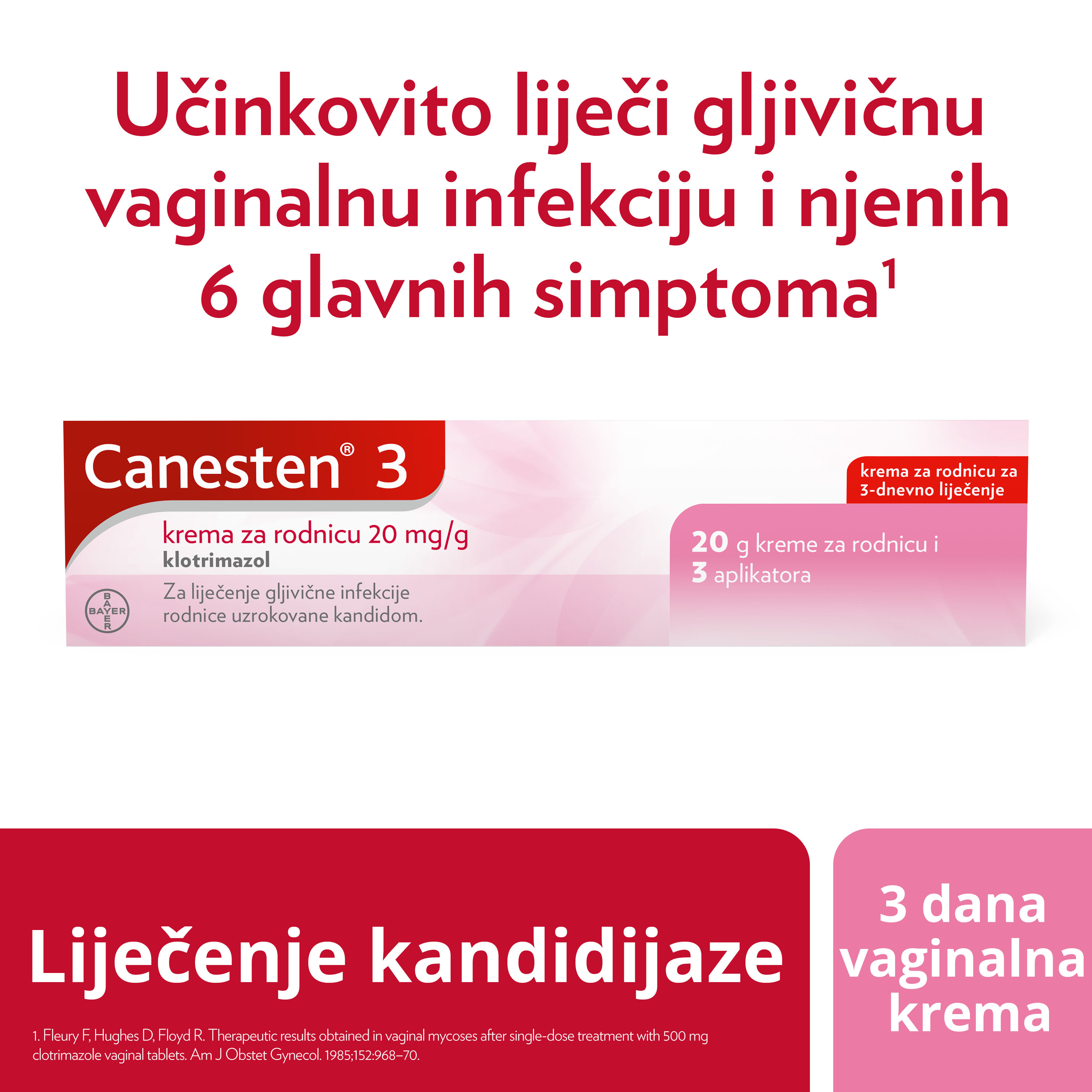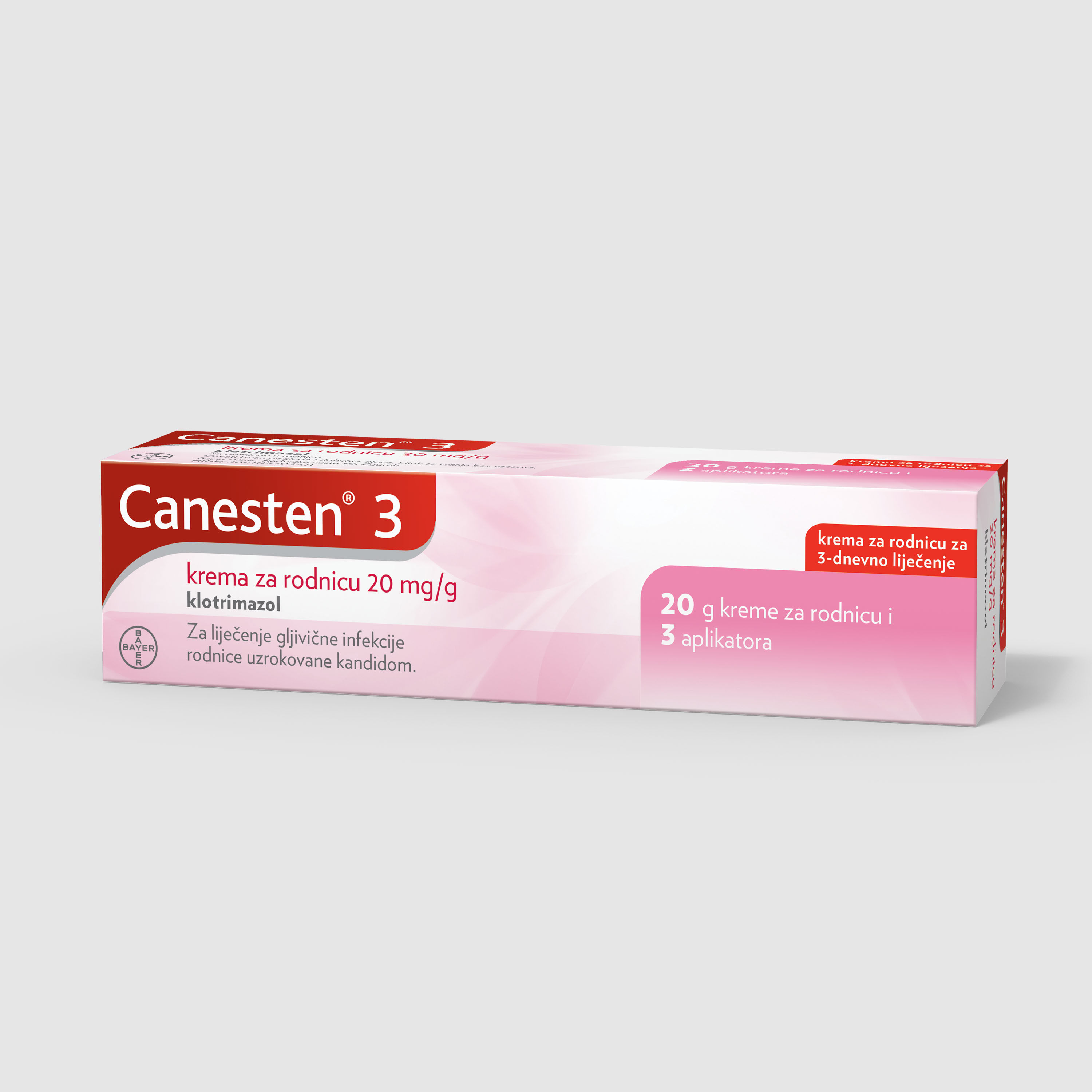 Canesten® je najprodavanija marka na svijetu za liječenje gljivičnih vaginalnih infekcija.1 Canesten® 3 krema za rodnicu 20 mg/g pruža vam učinkovito liječenje gljivičnih infekcija rodnice. Umirujuća krema za rodnicu isporučuje se u formatu standardne jačine i treba se primjenjivati tri dana zaredom. Namijenjena je onim ženama kojima je dulja primjena lijeka umjerene snage draža od jednodnevnoga liječenja. Taj je lijek jednostavan za primjenu, a nelagodni bi simptomi trebali početi iščezavati vrlo brzo. Canesten® 3 krema za rodnicu vam pomaže vratiti osjećaj ugode kako biste mogli nastaviti sa svojim životom.